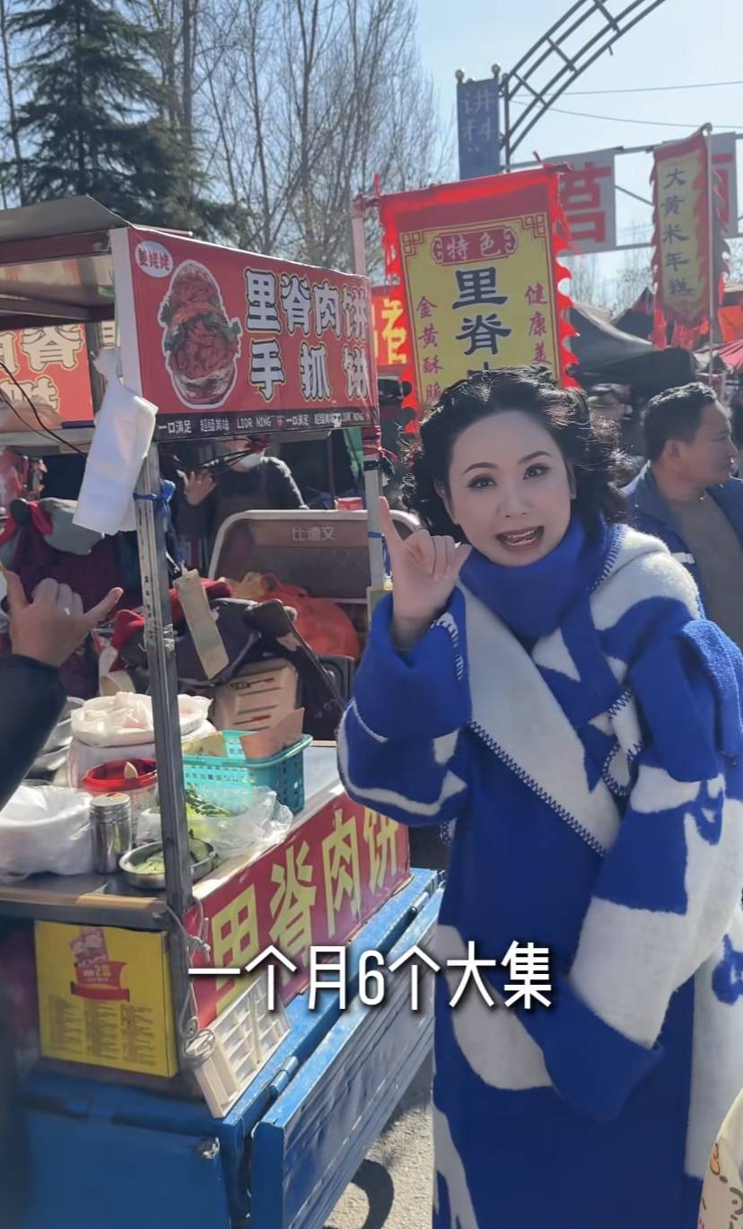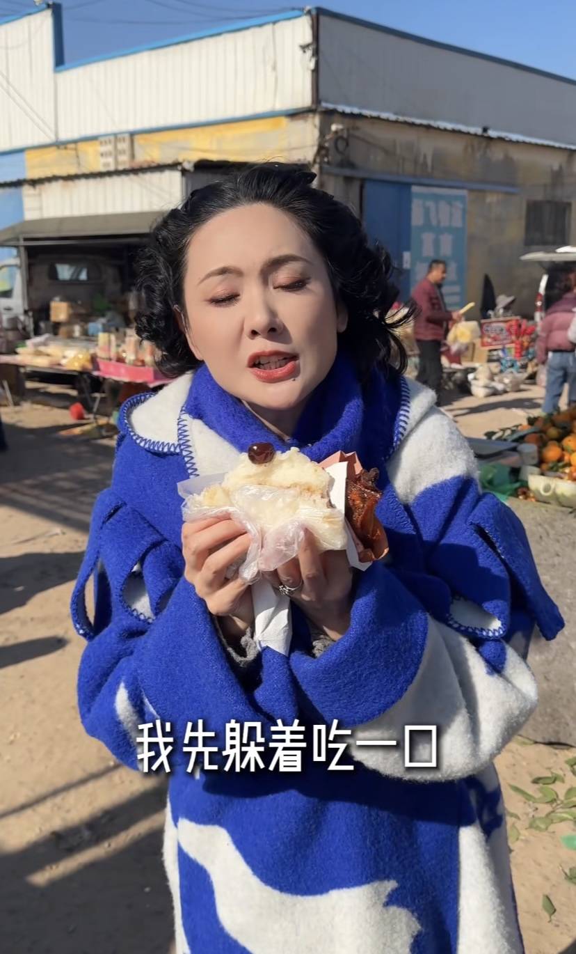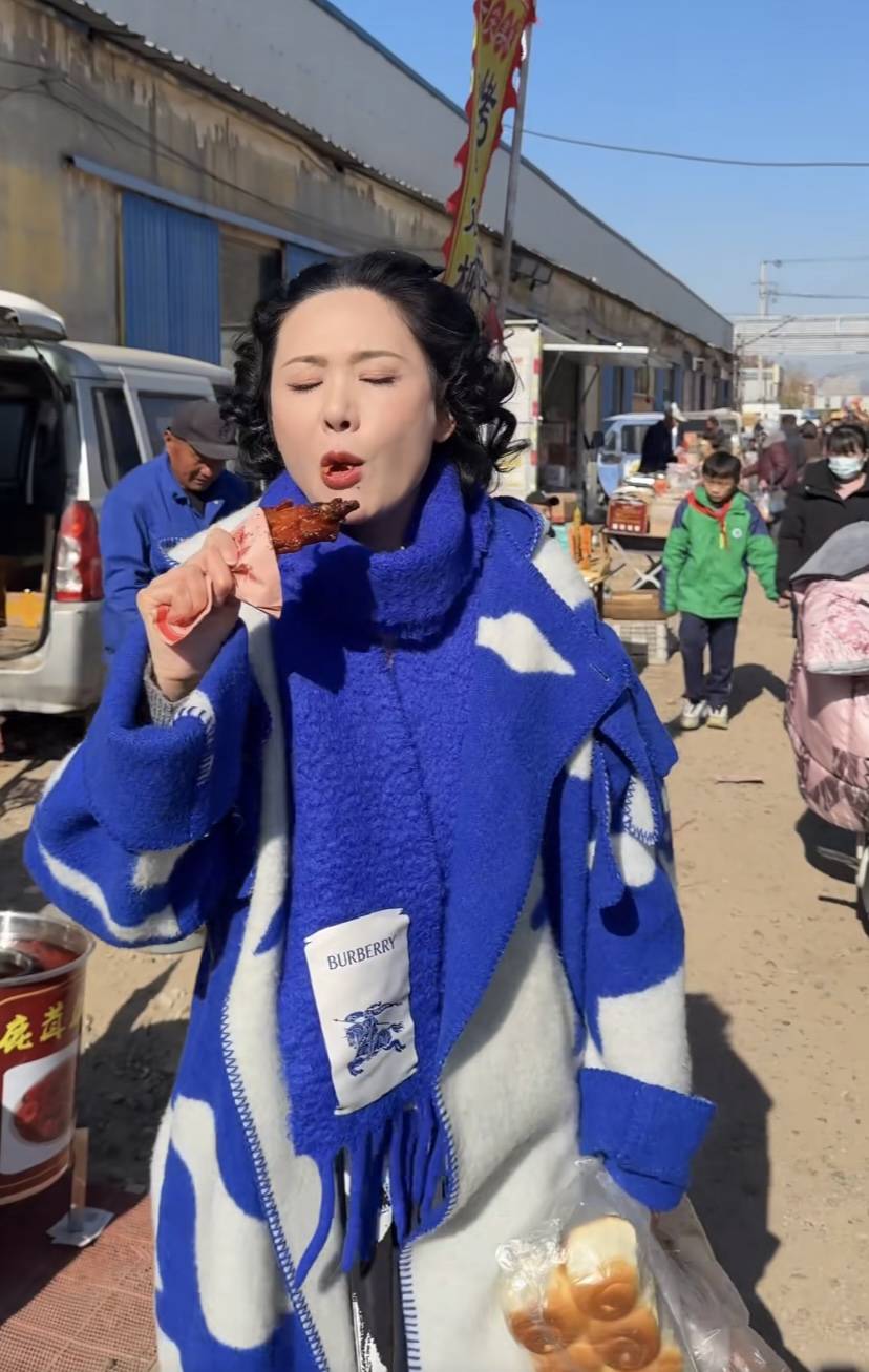 农村大集上的小吃,也都是热气腾腾的。程莉莎非常接地气,站在寒风里吃着肉夹馍,手里还拿着一个奥尔良鸡翅。