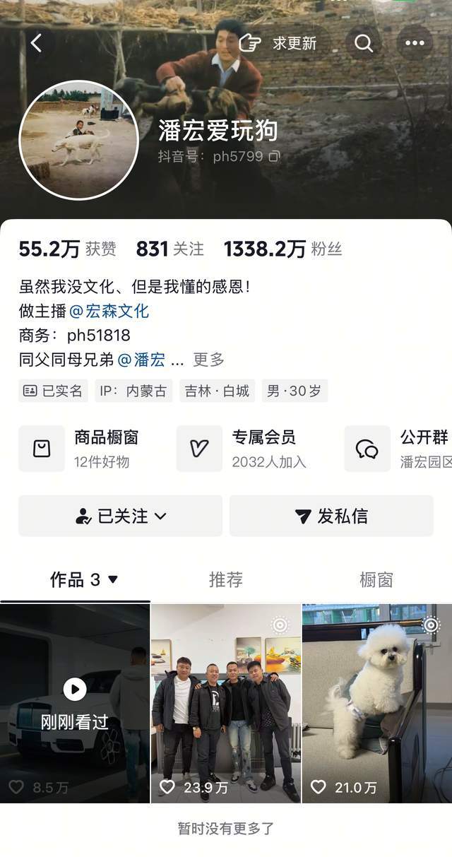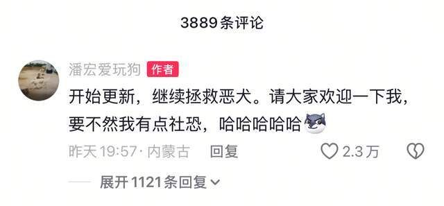 翻看该账号不难发现,点赞数量只有55万,视频数量则是三个,这就说明过往的内容已经全部被删除。虽然此次更新并不是潘宏风波后的首次,但却让诸多粉丝“沸腾”,因为自此之后,潘宏将正式回归网红圈,也会带来更多精彩的训狗画面。