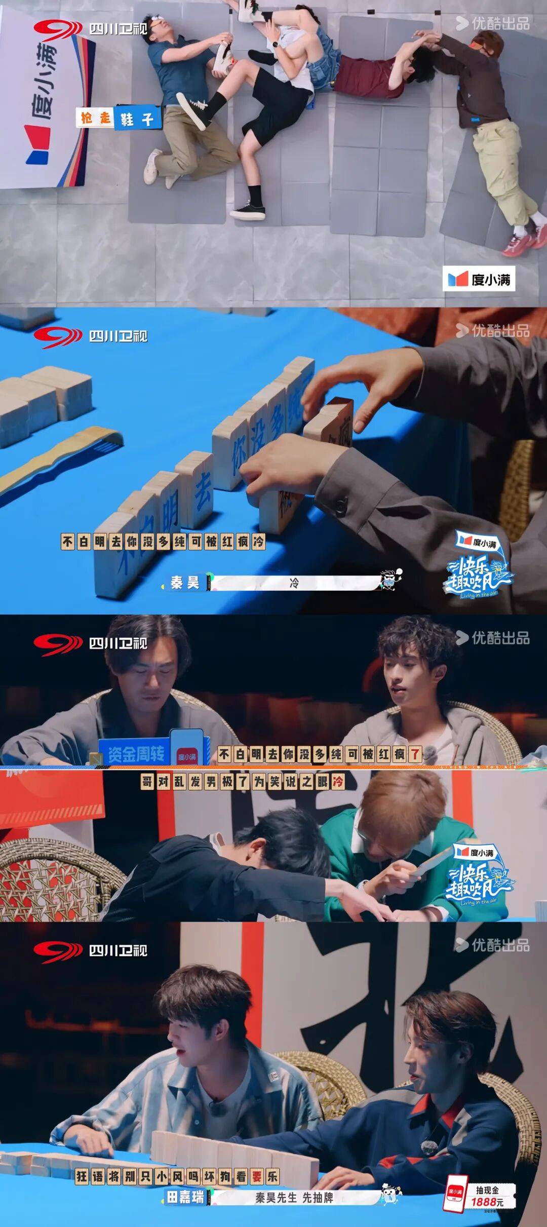 到了成都,文化梗玩得更飞。文字麻将仲裁大战里,徐志胜当牌桌警察,田嘉瑞做法官驳回秦昊“疯玩一辈渣”的无厘头牌面;秦昊和徐志胜在街头玩“你比划我猜”,一个双手被绑嘴叼奶嘴,一个认真猜出“走屁”,路人看了都以为真吵架。
