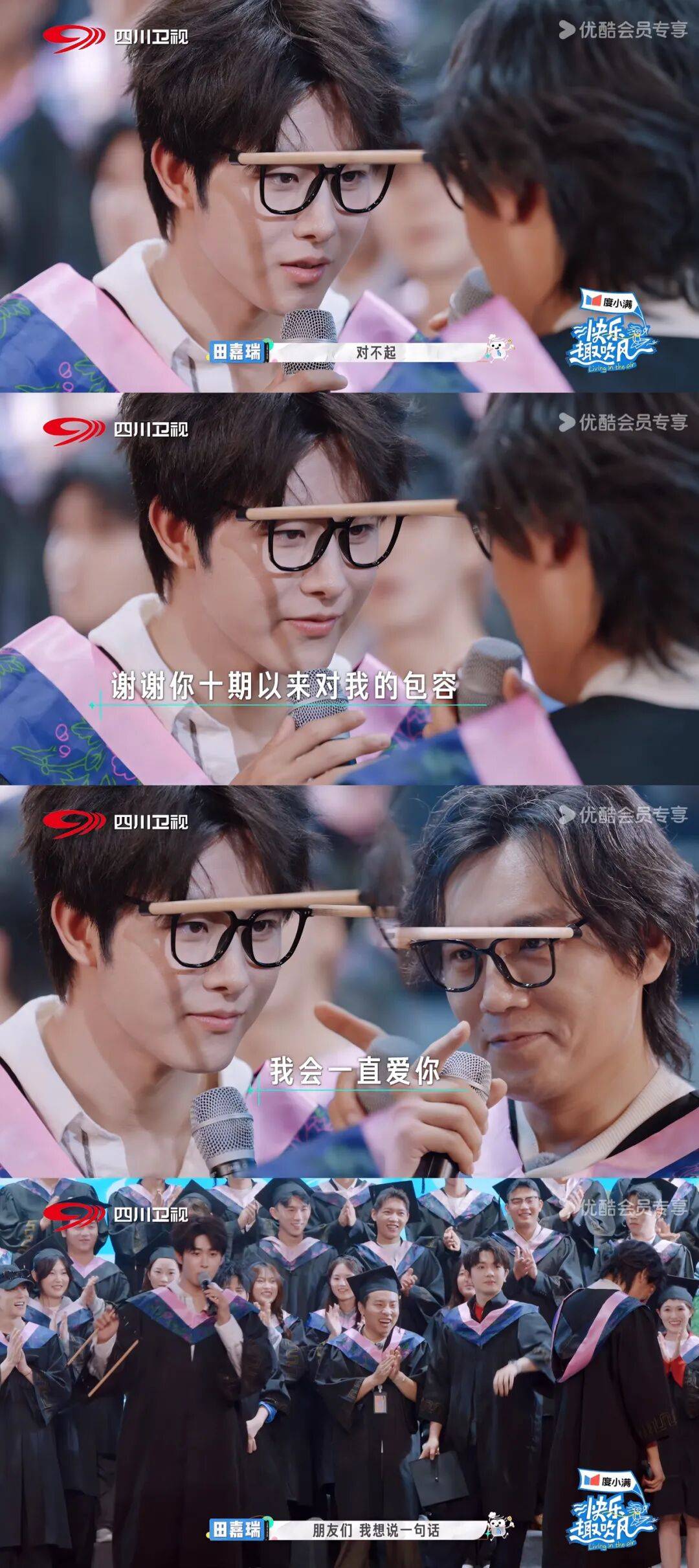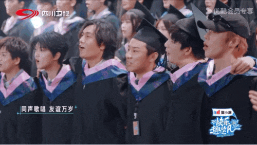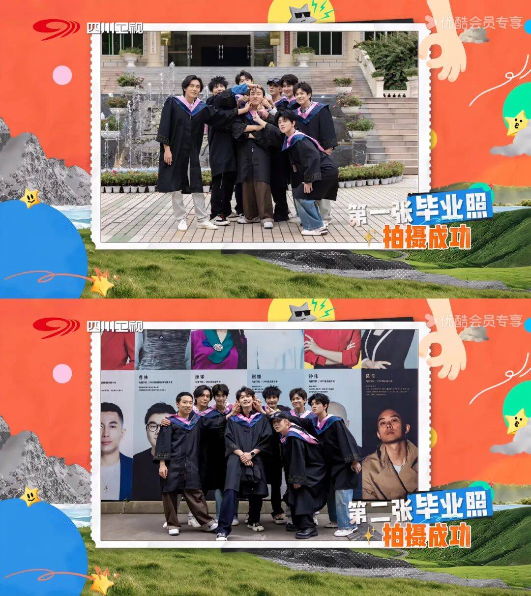 告别仪式从一套回忆杀毕业照开始。全员换上学士服,复刻节目初期的隐藏任务:集体掐徐志胜脸喊可爱、一起捏颜人中耳垂……当初略显尴尬的互动,此刻成了独家的快乐勋章。