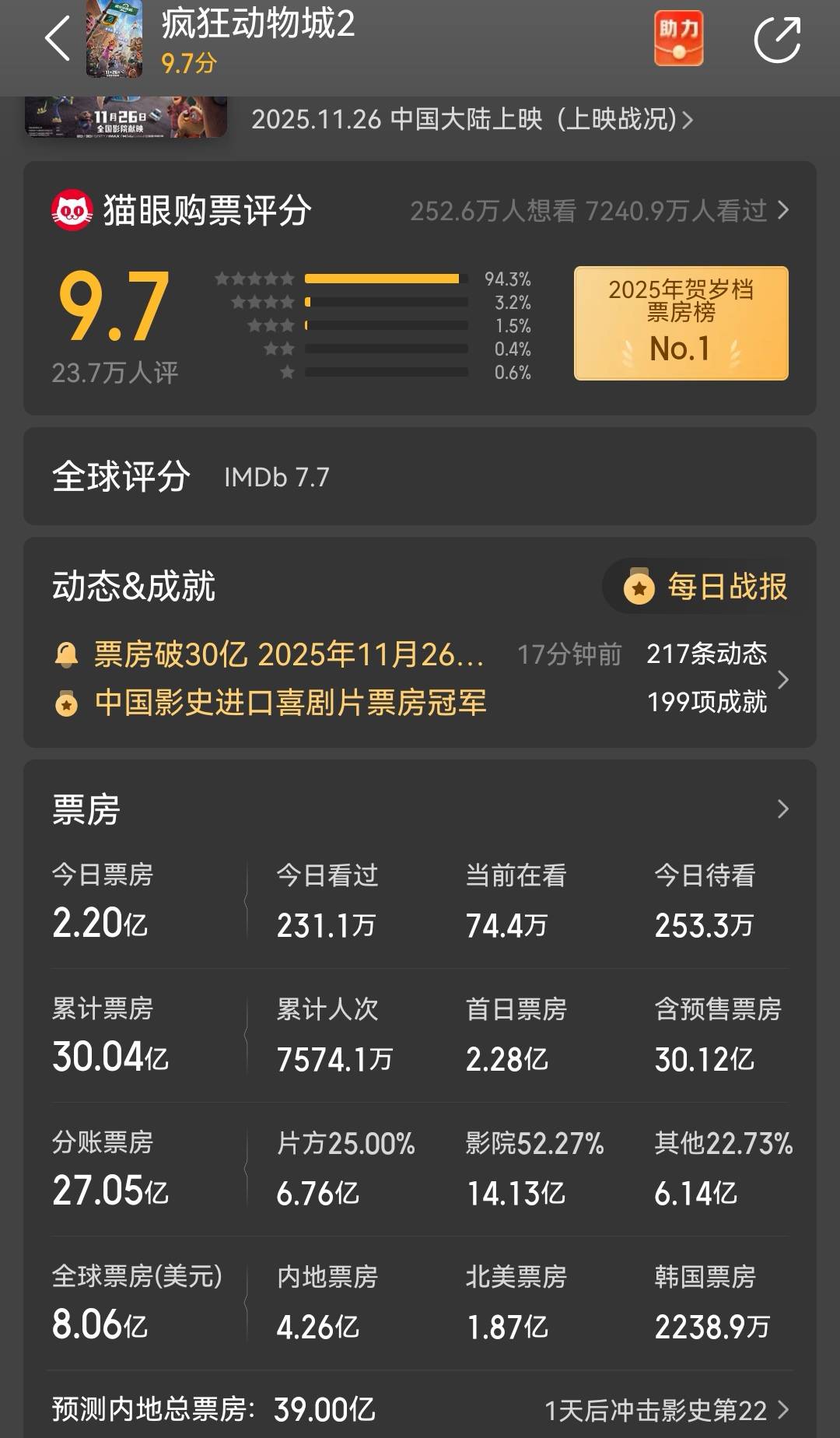 截止12月7日16:42,迪士尼动画续作《疯狂动物城2》上映第12天累计票房突破了30亿元,在进口片中仅次于《复仇者联盟4》,排在第二,在中国影史票房榜中暂居第26名。按此走势,猫眼专业