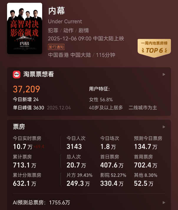 麦兆辉执导,郭富城、任达华、吴镇宇、方中信等主演的港片《内幕》于12月6日上映,首日排片占比3.5%,收票房408万元,上座率7.8%。次日排片占比3.1%,收票房295万元,上座率7.2%,远不如同档期其他热门电影。