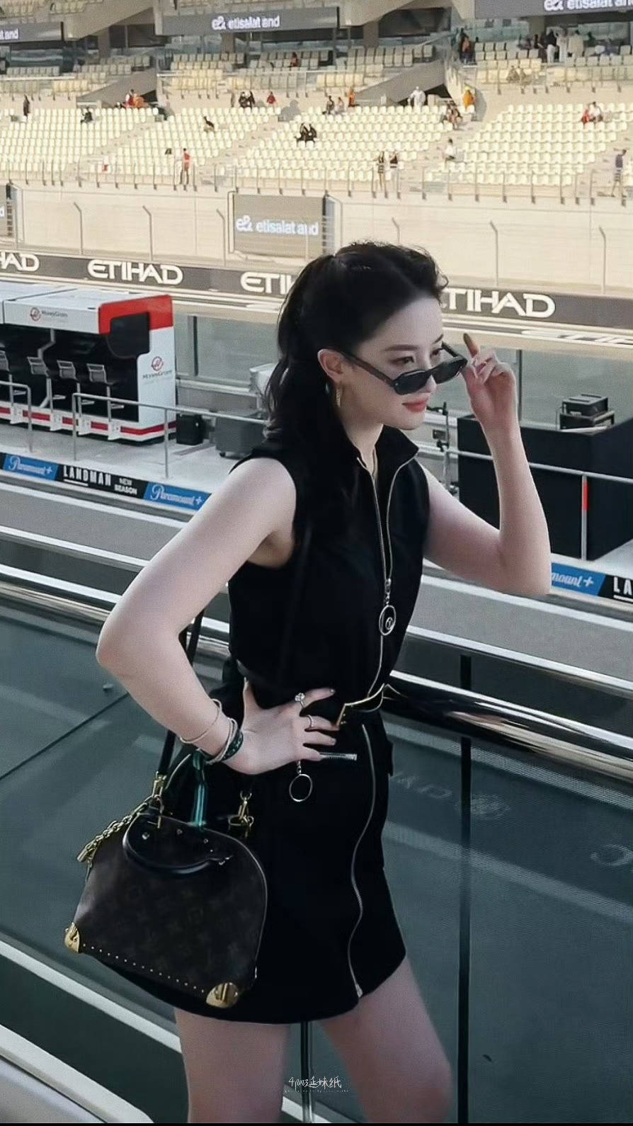 据悉,刘亦菲自2023年起便担任阿布扎比旅游体验代言人,参与F1赛事推广是其职责所在。但这次亮相的“含金量”显然超标了。她不仅是东道主的旅游代言人,更是赛事重要赞助商、全球奢侈品巨头LVMH集团旗下两大王牌——路易威登(LV)与宝格丽的品牌代言人。这一身行头,可谓将“代言人”身份穿在了身上:全套路易威登黑色无袖束腰短裙,搭配利落高马尾与墨镜,干练飒爽,被粉丝誉为“体育记者穿搭范本”。现场生图里她粉白透亮的肌肤状态,更让网友感叹“38岁的美貌是真实存在的吗?”