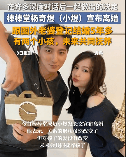 12月8日,据台媒报道,棒棒堂杨奇煜(小煜)和圈外老婆言言今早通过社交媒体平台宣布离婚:“这是我们在许多深度的对话、理解与沉淀后一起做出的决定,带着感谢也带着祝福。&rdq