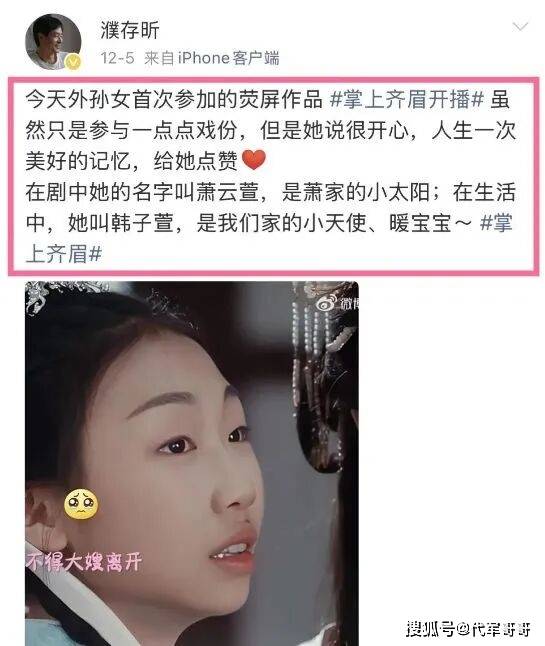 72 岁的国家一级演员濮存昕罕见在社交平台连发三条动态,为 11 岁外孙女韩子萱参演的短剧《掌上齐眉》造势,字里行间满是外公的骄傲:“剧中是萧家小太阳,现实是家中暖宝宝”。这一行为被网友解读为 “星三代正式进军娱乐圈” 的信号,迅速登上热搜。韩子萱饰演的 “萧云轩” 虽戏份不多,但作为濮存昕的长孙女,其首次触电便承载了公众对 “艺术世家传承” 的复杂期待。
