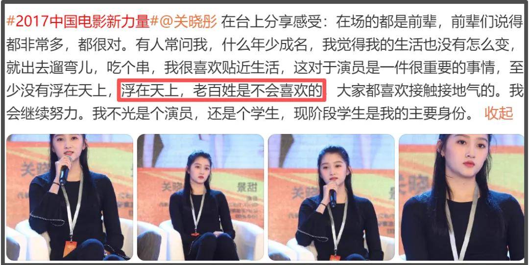 除了评论区沦陷之外,关晓彤过往争议言论也被扒了出来。2017年,关晓彤在参加某活动时分享自己的感受,直言自己喜欢贴近生活,没有浮在天上,还表示“浮在天上,老百姓是不会喜欢的”。