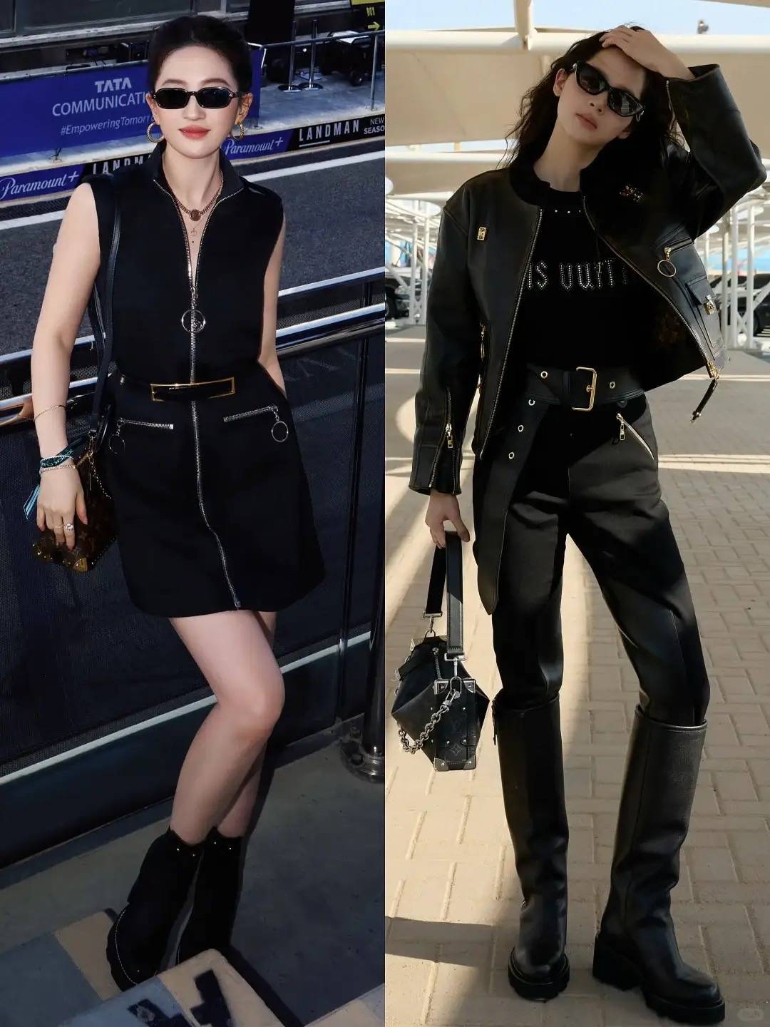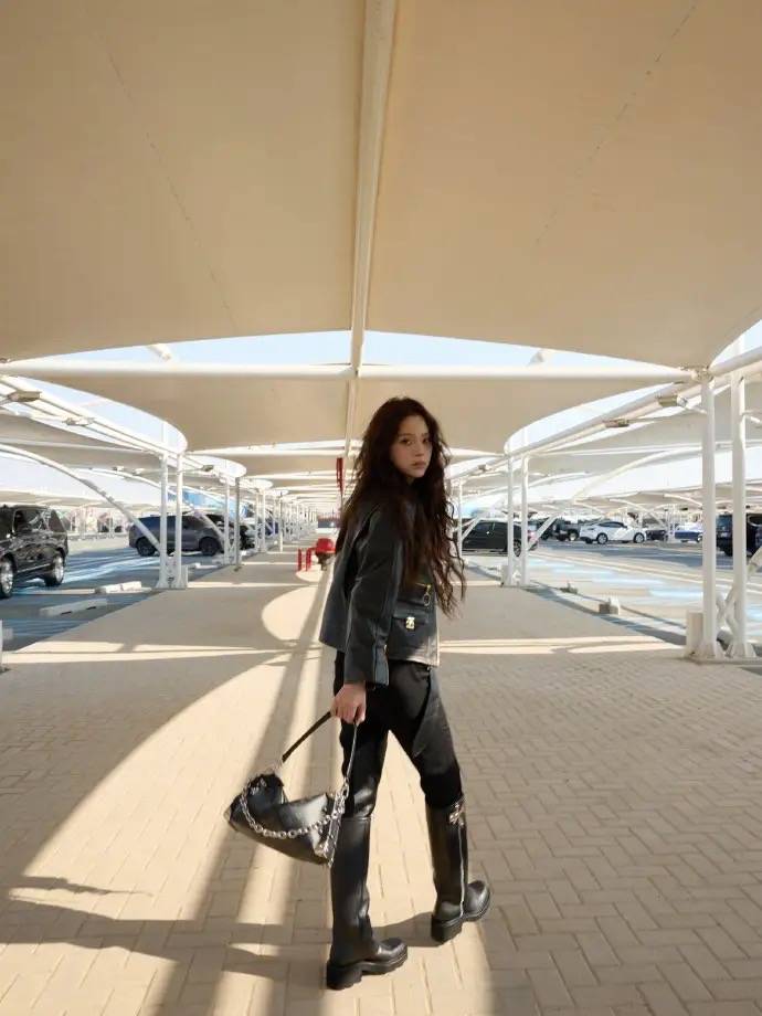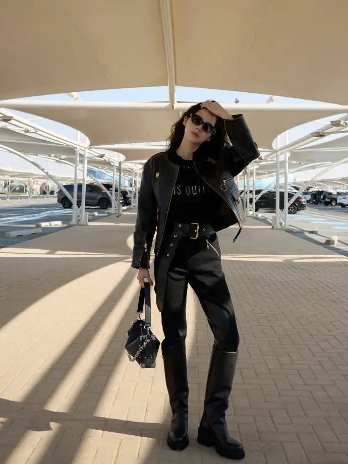 黑色皮质夹克,搭配LV金属字母T恤,同色系工装裤搭配宽腰带,厚底长靴拉出双腿线条,有一种气场全开的冷艳感。
