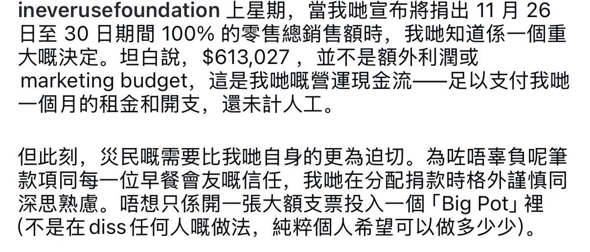 而伸出援手的方式就是捐款,于是徐天佑夫妻决定捐出自营的护肤品概念店的5天的零售销售总额,他们统计了一番,共计捐出了61.3万元。虽说要捐出五天的营业总额,实际上捐出的款项远比预计的要多,徐天佑称这61.3万并不是额外的利润,或是市场成本,而是他们整个店铺现有营运的流动资金,而这一笔钱足够他们支付一个月的店铺租金以及开销。虽然几乎是一个月的店铺开销,但是想到灾民,他们决定这一分钱捐出去是迫切的,有需要的。