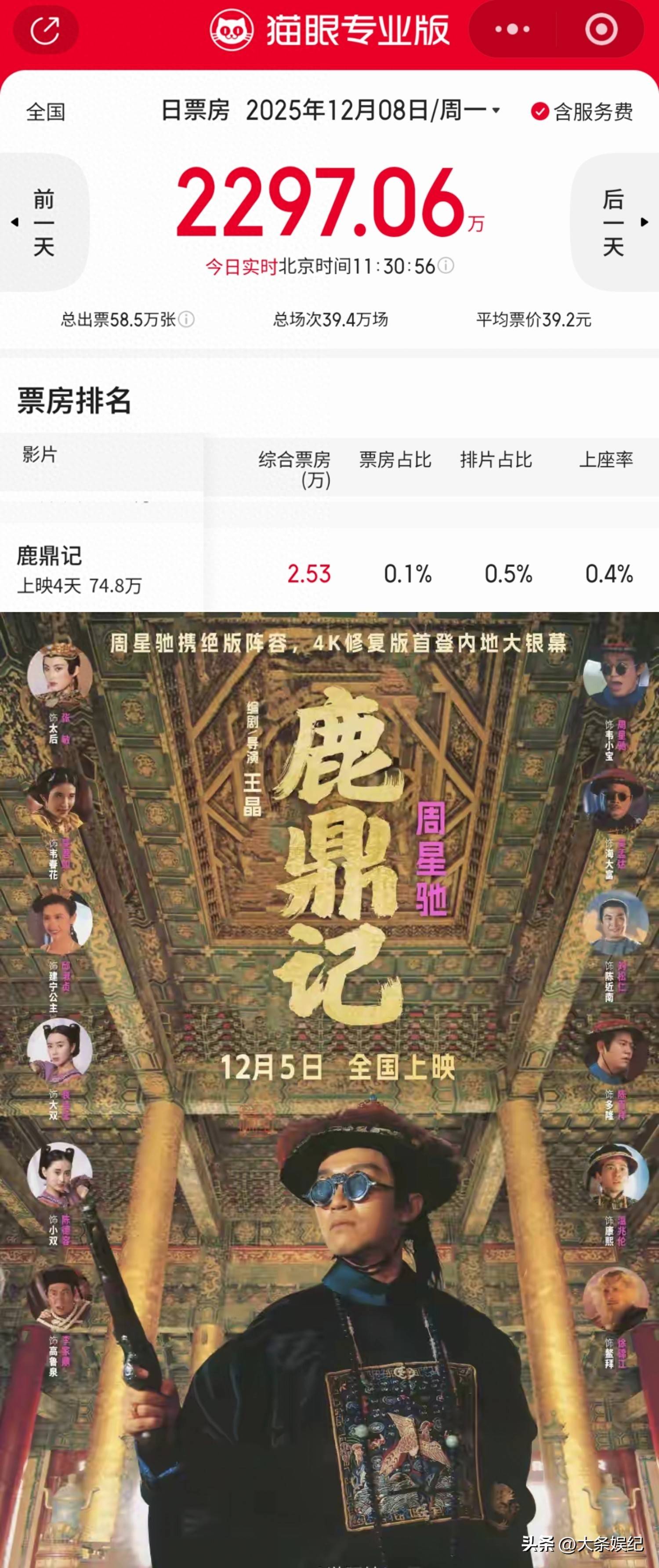 周星驰的《鹿鼎记》4K修复版,上周在内地电影院正式亮相。这部距离首次上映已经过去33年的经典影片,本以为会凭借情怀吸引不少观众,结果首日票房只有18万元,而且影院的排片占比极低——第一天还能维持在约1.1%,第二天就掉到0.5%左右。这样的表现,确实出乎不少影迷的意料。