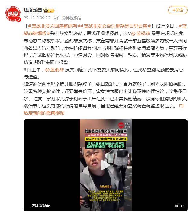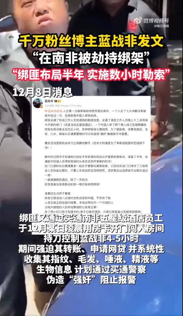 12月9日,知名网红蓝战非在微博超话的一篇长文,彻底引爆了网络。他首次正面回应了此前震惊全网的“南非绑架事件”,不仅以惊悚细节撕开了这场噩梦的帷幕,更直接喊话质