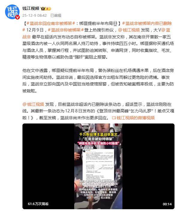 目前,蓝战非最初爆料绑架细节的超话动态已被删除,虽未解释原因,但结合其“不希望被无故猜忌与造谣”的呼吁,或许是不愿细节被过度消费与曲解。