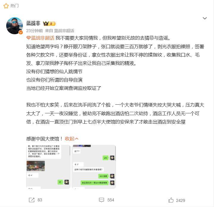 12月9日,知名网红蓝战非在微博超话的一篇长文,彻底引爆了网络。他首次正面回应了此前震惊全网的“南非绑架事件”,不仅以惊悚细节撕开了这场噩梦的帷幕,更直接喊话质疑者:“没有仙人跳,也没有自导自演”。
