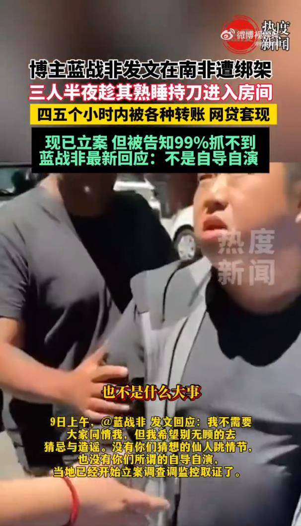 案件发生后,网络上不乏“自导自演炒作”、“剧情离奇”等猜疑声。对此,蓝战非在回应中明确否认,并强调案件已由南非警方正式立案,正在调取监控等证据进行侦查。他透露,绑匪离开后,因极度恐惧对方杀个“回马枪”,他不敢出门,只能用身体死死顶住房门,在巨大的精神压力下煎熬,直至次日早上7点半中国大使馆的安保人员抵达,才被转移至安全屋。他坦言自己情绪崩溃大哭,“一天一夜未眠,压力极大”。
