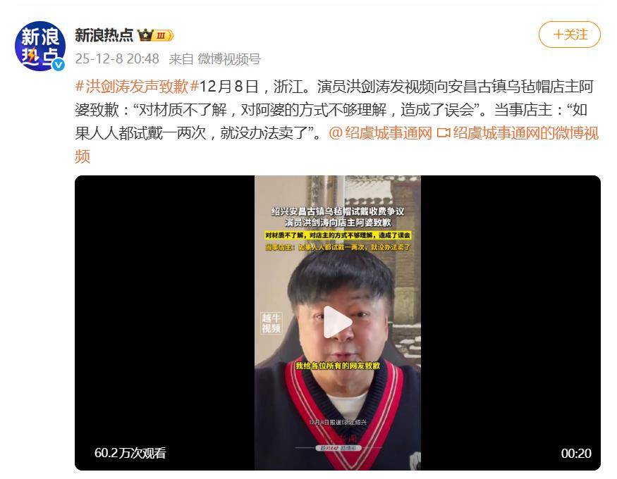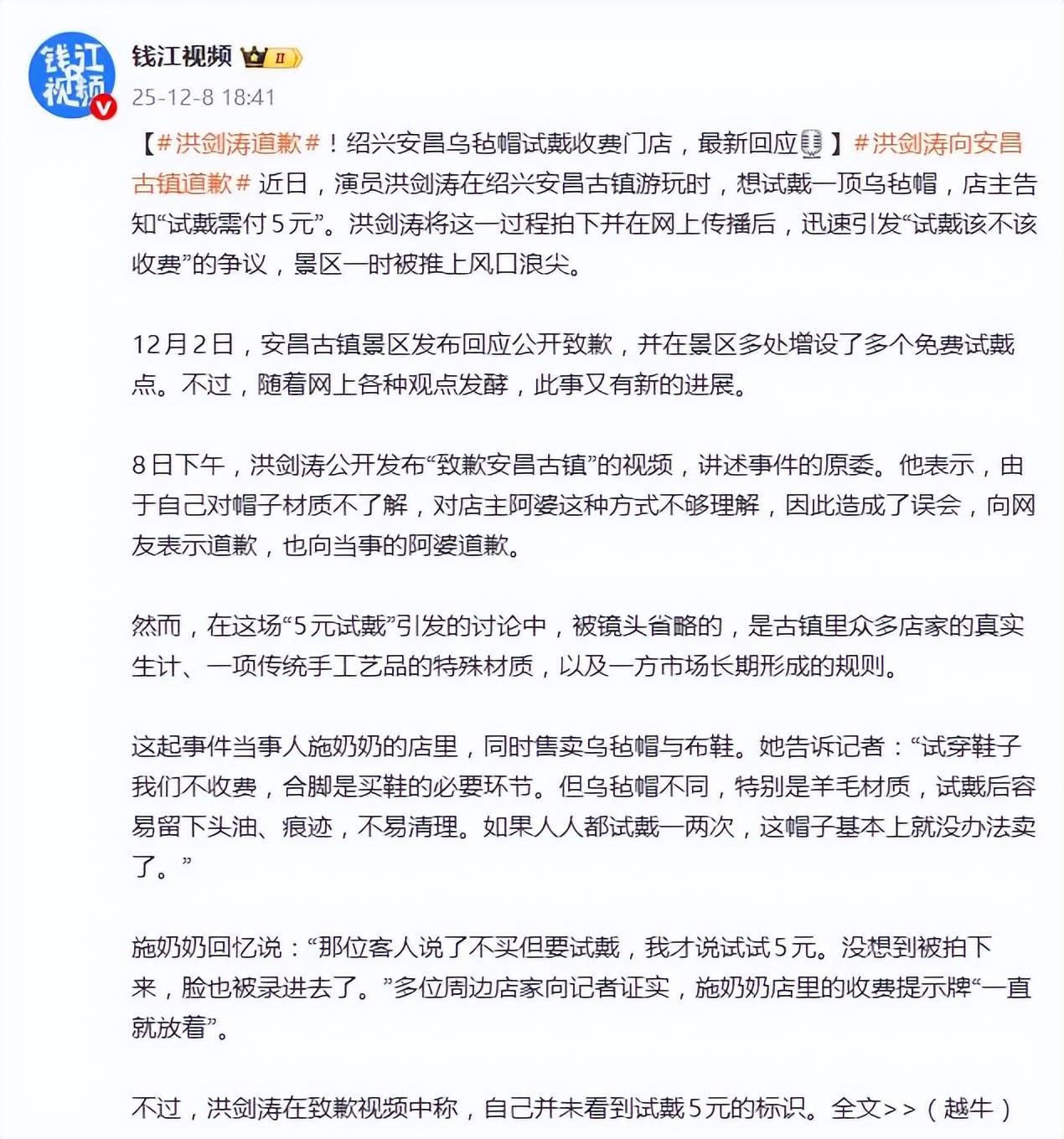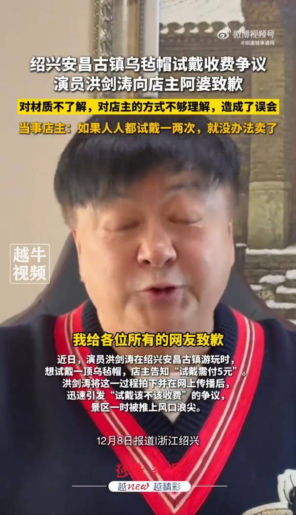 据12月9日报道,一句“对材质不了解,对阿婆的方式不够理解”,让演员洪剑涛的公开致歉冲上了热搜。这场因“试戴一顶帽子该不该收5块钱”引发的风波,看似是