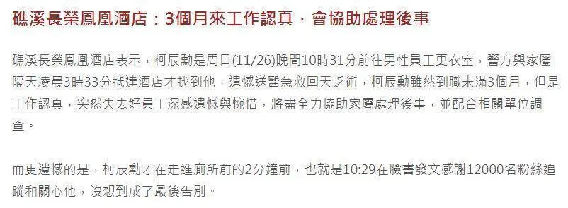 当天,年仅20岁的歌手柯辰勋在一家饭店的员工更衣室里被发现。当时他已经昏迷倒地,被送医后不治身亡。
