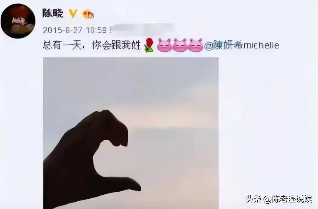 他们在微博发了拼接成完整爱心的照片官宣,陈晓那句“总有一天,你会跟我姓”的告白,现在想想还是很有爱。