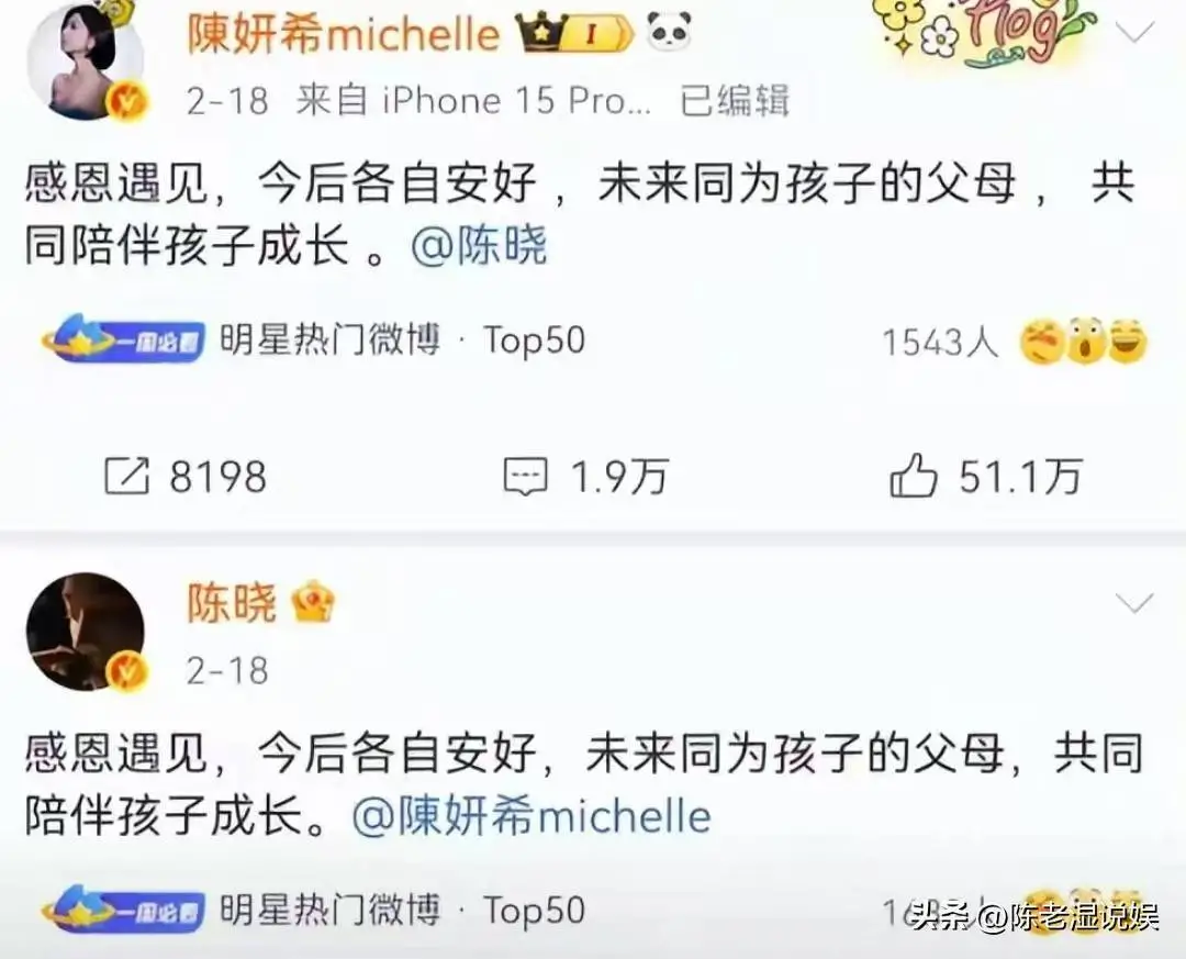 但是后来两人婚变的消息是越传越真,还有消息说两人其实早已经分居,陈晓甚至拉黑了陈妍希的联系方式。