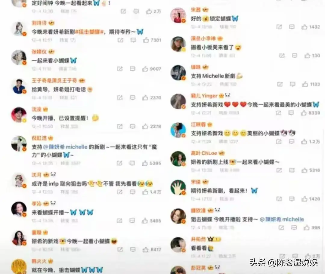 最近42岁的陈妍希官宣新剧《狙击蝴蝶》,引起了许多人的关注。不仅仅是剧情的好看,更让人注意的是她“人脉广”。官宣微博下面各类一线明星都有,甚至还有财经博主以