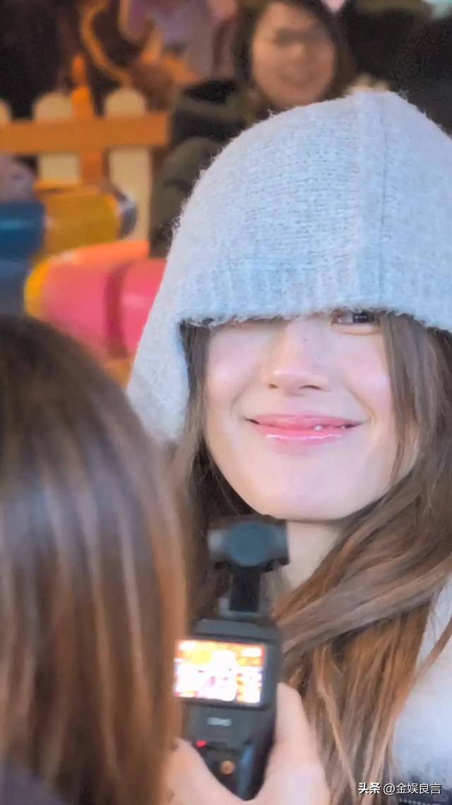 再看全身照,她戴着帽子,正和工作人员开心的交谈着什么,手还在空中没有放下。