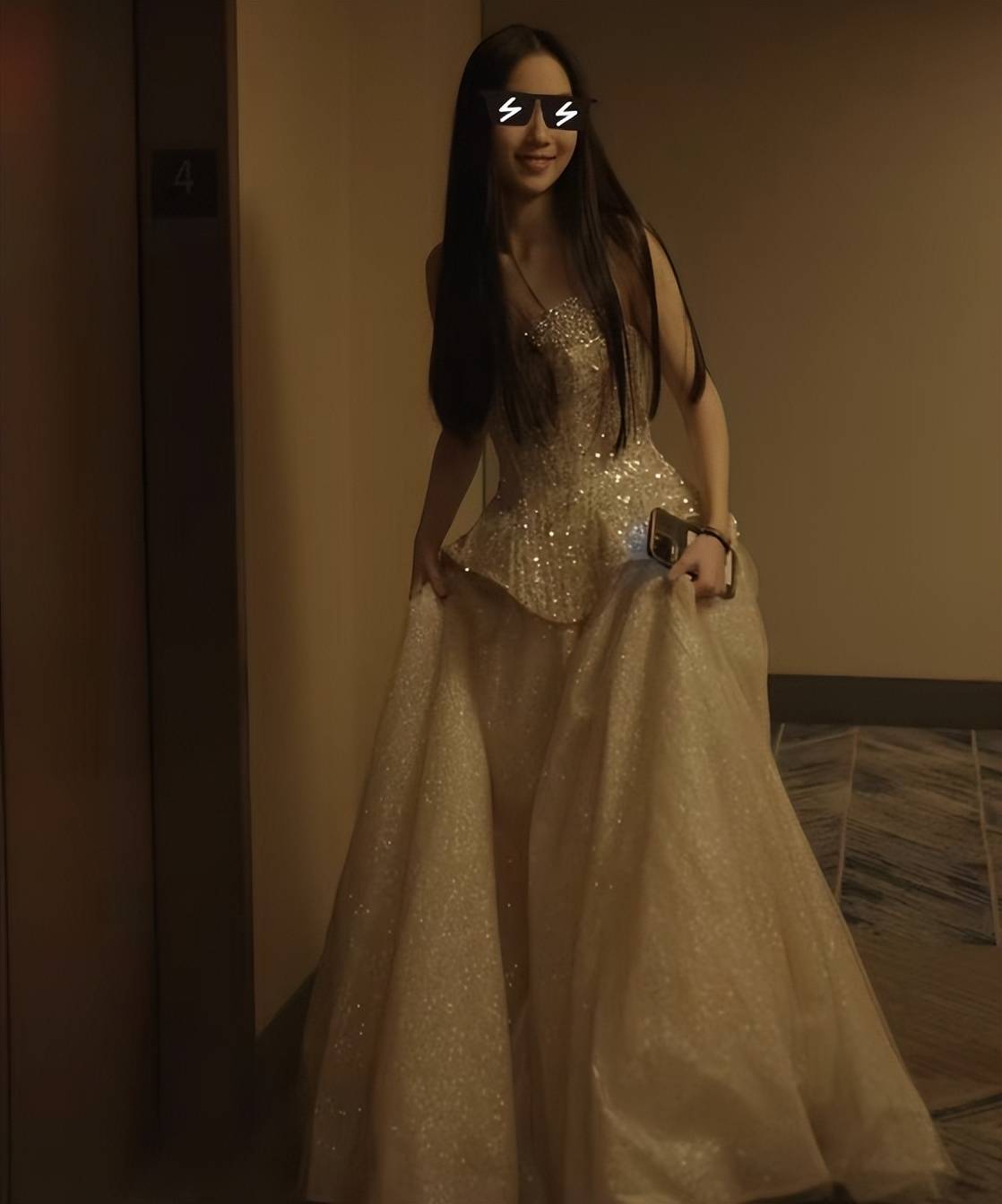 礼服是无肩带的款式,布料有些亮片或珠光质感,打灯光的时候会反光,属于特别适合宴会或派对的类型。抹胸设计把锁骨、肩颈线条都露出来,配上她这种偏瘦的身材,整个人显得很干净利落。站着的时候,背挺得很直,不是那种扭来扭去、刻意凹造型的状态,而是有点小紧张,又有点开心的那种自然姿态。