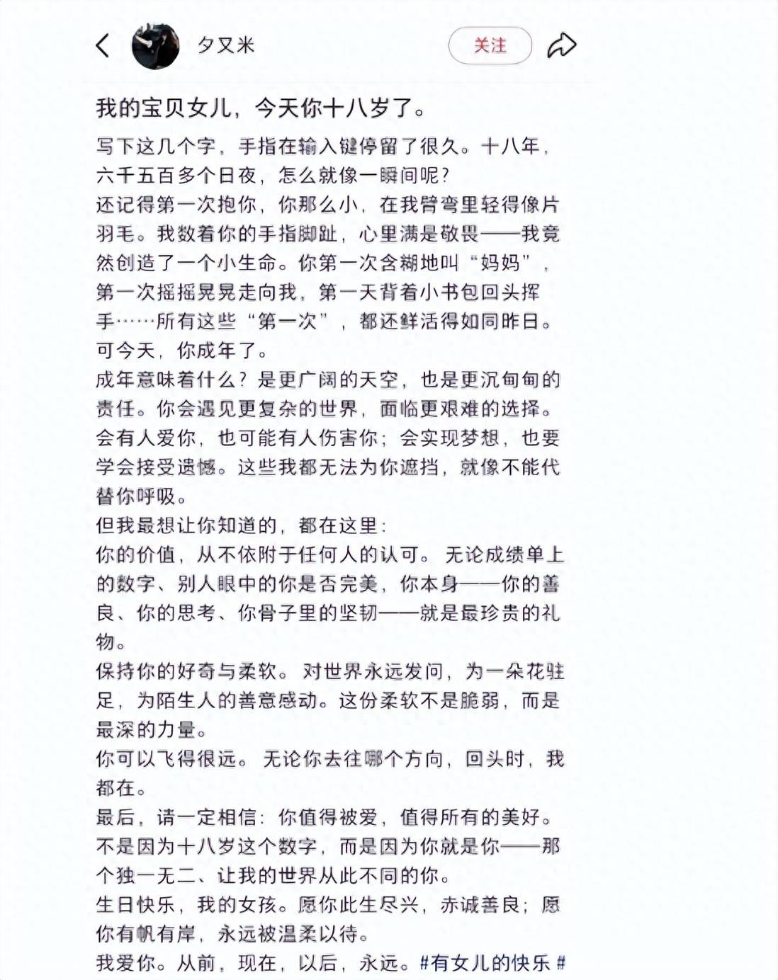 这也是很多重组家庭比较微妙的地方:父母的关系改变了,但孩子和双方的血缘关系并不会变。夕又米选择在这个时点,写一段很长的文字给女儿,说“无论发生什么事情,我永远站在你身后”这种话,其实也不只是日常“鸡汤”,多少是对过去这些年母女相处的一次总结,对未来的一次兜底承诺。