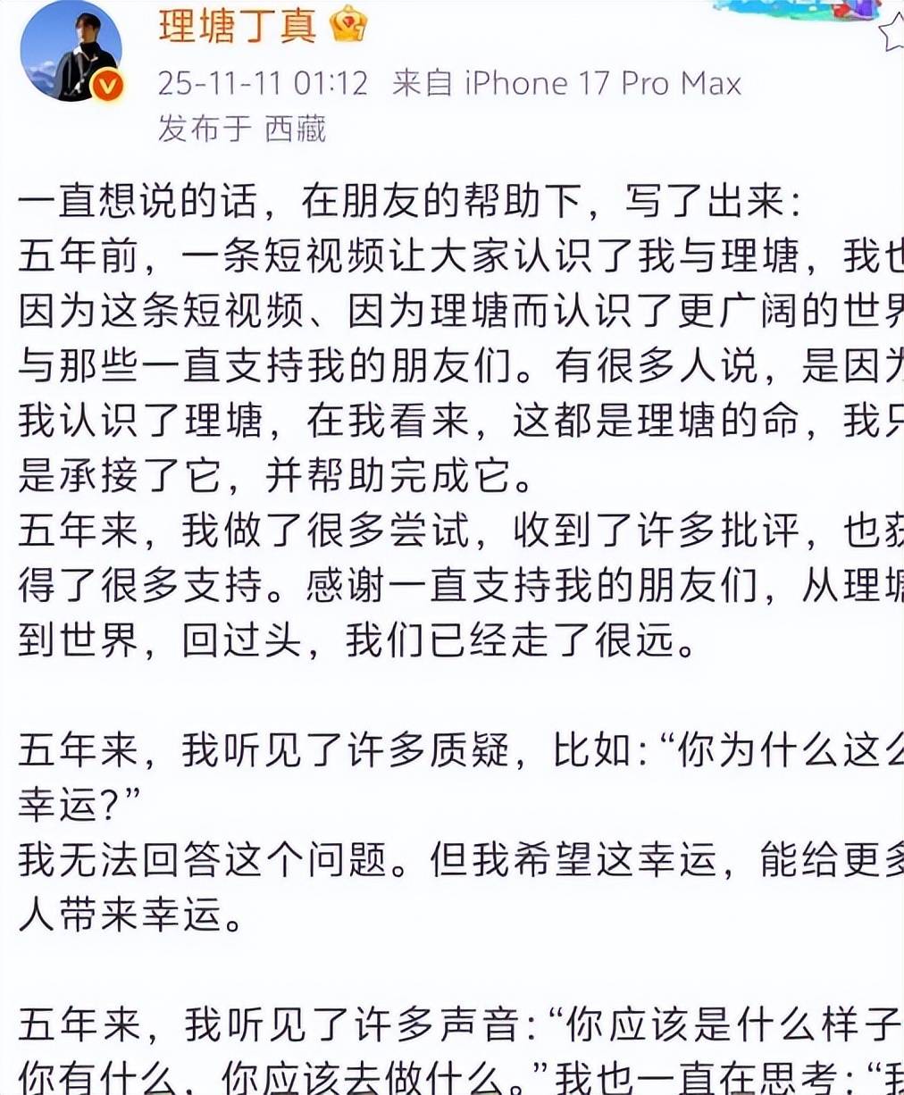 丁真的清醒,有其坚实的来路。2020年凭纯真笑容走红网络后,他迅速被推向风口浪尖,成为理塘旅游大使、四川文旅宣传推广大使,从网红向娱乐圈转型。伴随巨大关注而来的,是持续的质疑与汹涌的网络暴力。有人质疑他“变了,变成大城市里的人了”,更有甚者直接打电话对他进行辱骂。丁真曾回忆,走红后最想哭的瞬间,是头痛打点滴时想拍照给父母,却被工作人员立刻删除照片,那一刻他意识到“自己必须要强大”。面对攻击,他选择让对方说完,再平静反问:“那你现在满意了吗?”