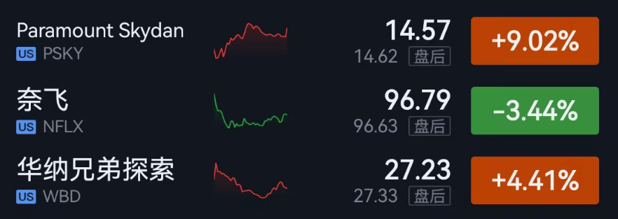 受消息影响,美股收盘时华纳兄弟探索股价上涨4.41%,派拉蒙天舞上涨9.02%,奈飞则下跌3.44%。