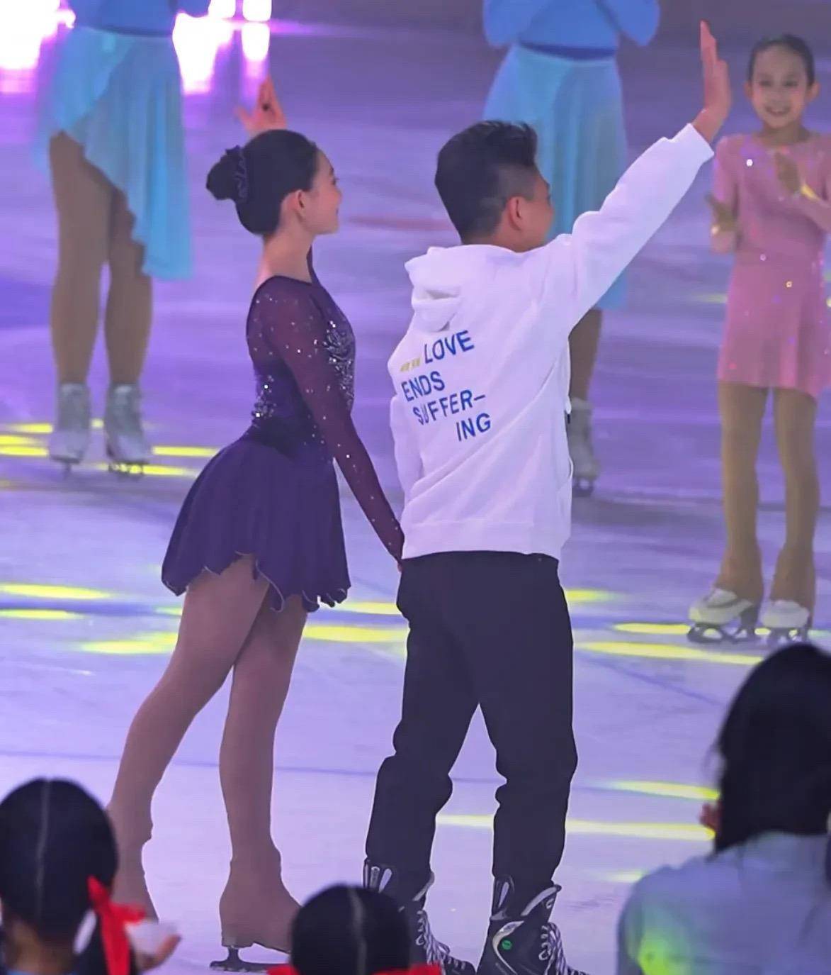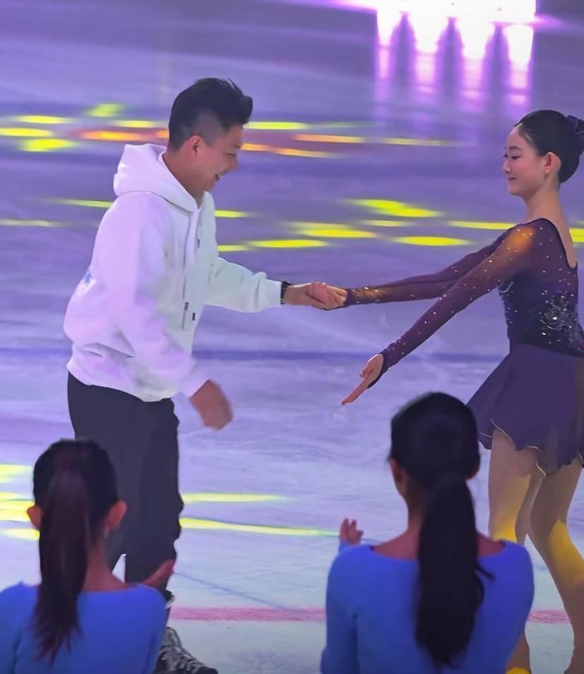 复杂的动作全是奥莉自己完成的,李小鹏只是在场亮个相,和大家打个招呼,偶尔还能做一些简单的滑行动作。