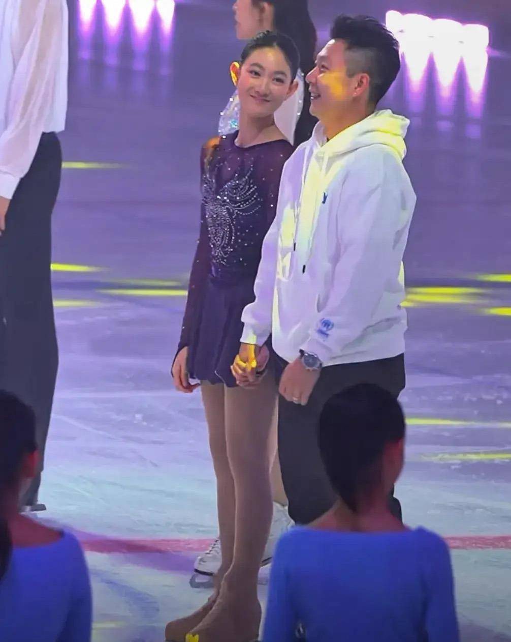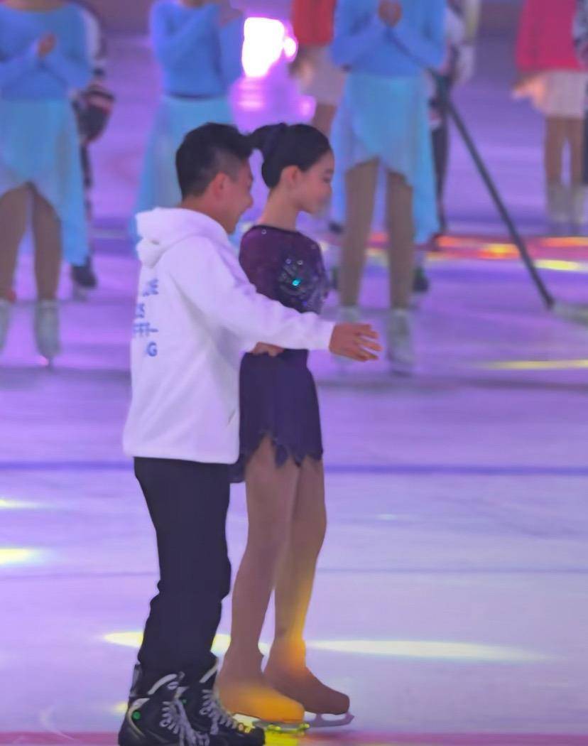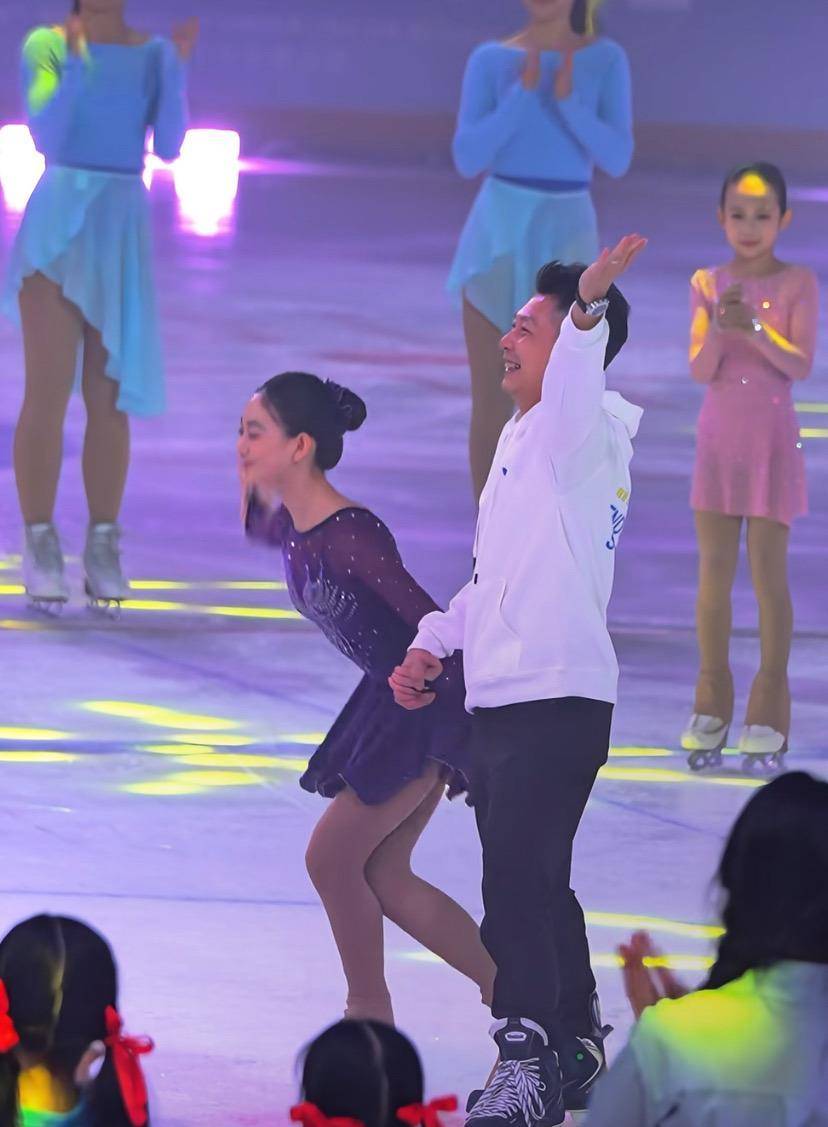 对于李小鹏来说,花样滑冰不算特别熟悉,虽然平时会陪着女儿练习,但一到正式上场还是有点紧张。可以看得出他四肢有点僵硬,基本上都是女儿在照料他、引导他。