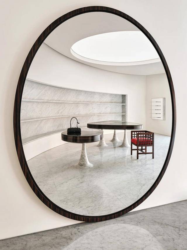 外立面用的是卡拉拉大理石,圆形和弧形窗口设计,一看就很有品牌标志性的镂空图案那味儿。