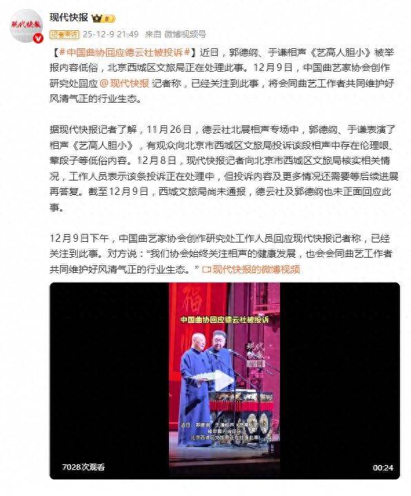 事件的导火索是11月26日北展剧场专场上表演的《艺高人胆小》。有观众较了真,认为这段子里充斥着“伦理哏”和“荤段子”,越过了公序良俗的底线,反手就是一个投诉。目前,这把火已经烧到了监管部门——西城区文旅局确认“正在研判处理中”,而德云社方面也已悄然将该作品从演出库中下架,静候发落。