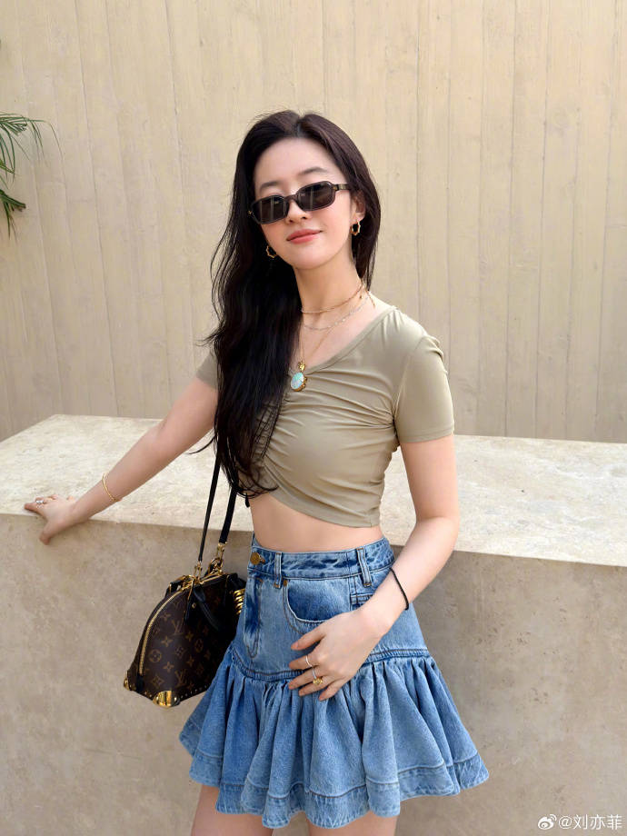先从这身穿搭说起。刘亦菲这次的OOTD可以用四个关键词概括:露脐短袖、牛仔百褶裙、黑色短靴、手持墨镜。单品一个比一个基础,但组合起来却意外高级、减龄又显身材。露腰款式的短袖,是整个造型的“关键一刀”,把最细的腰线干净利落地露出来,直接把身体比例切成“上短下长”,视觉上腿长分分钟拉满。她的腰腹部几乎看不到赘肉,没有刻意练出明显腹肌,但线条非常干净紧实,是那种“自然瘦、健康瘦”的状态。
