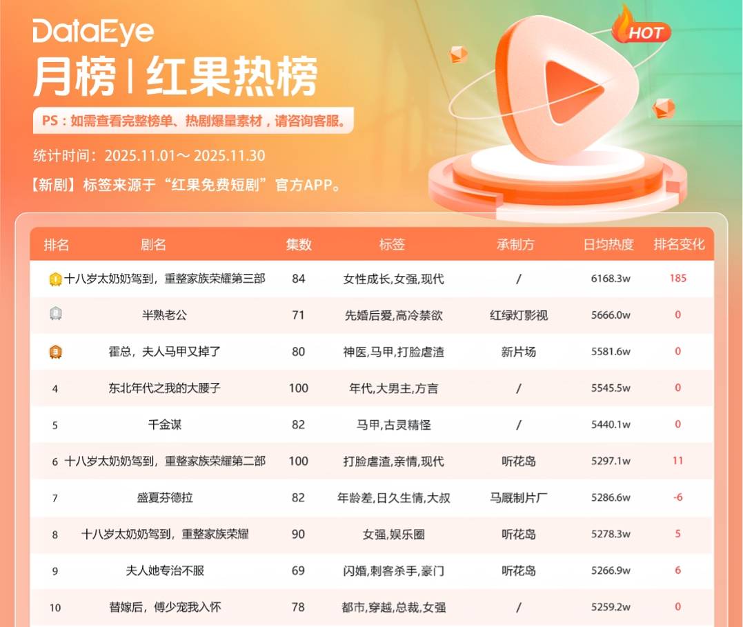 而红果短剧方面,《十八岁太奶奶驾到,重整家族荣耀3》《半熟老公》《霍总,夫人马甲又掉了》分别拿下前三甲,《太奶奶3》更是创造日均热度6168.3万。