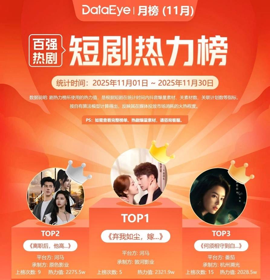 根据DataEye数据,尽管在绝对头部的数据表现上逊于10月,超2000W的热门剧仅有三部(少于上月同期的五部),但新剧整体表现良好,有25部微短剧热力值超千万(多于上月同期15部),新剧上榜67部也多于上月的51部。