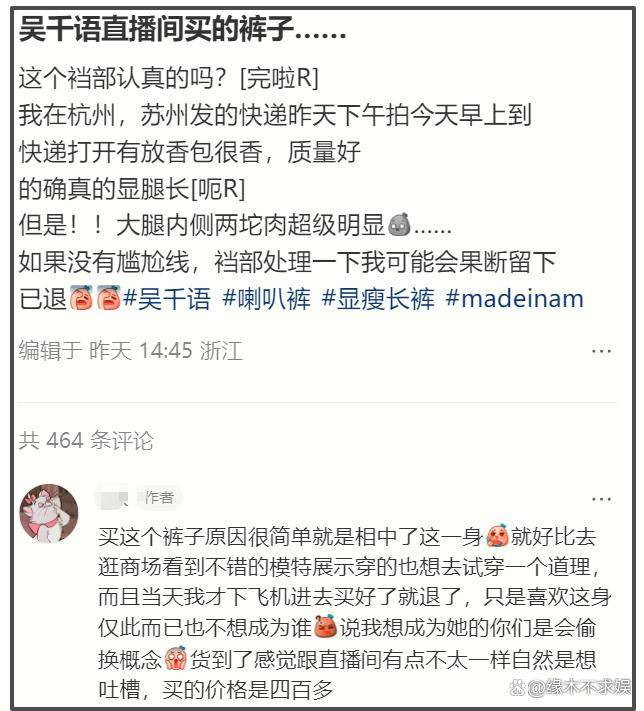 有买家晒图吐槽,说看直播时觉得衣服上身特别好看,版型也不错,到了自己手里一穿,镜子里完全是另一回事,材质一般,剪裁对普通身材不太友好。有人干脆直说:这衣服可能只适合她那种身材和镜头滤镜,不适合日常通勤的普通人。于是出现另一幕:头天直播间“手速飞快”,隔天退货页面同样排队。