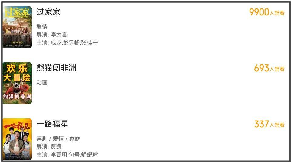 十二部新片刚刚好一天一半,12月31日上6部,1月1日上6部,一天有55岁古天乐主演的《寻秦记》,一天有71岁成龙主演的《过家家》。