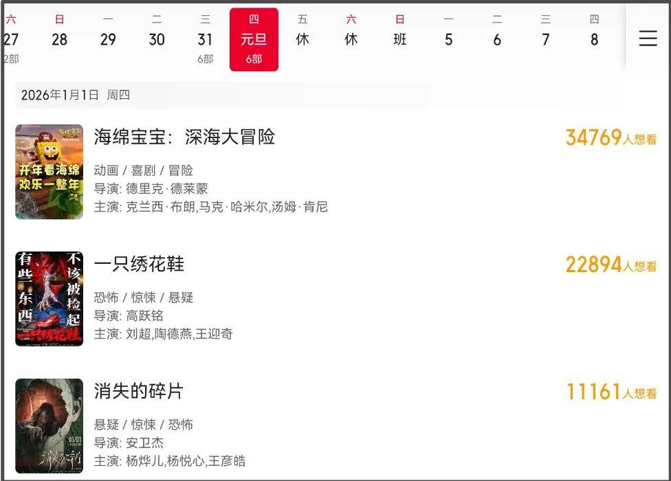跨年档12部新片数下来,可以说大半都是无效上映,真正有票房竞争力的不超过五部,除开一部《海绵宝宝》动画电影,能拿到有效排片冲击档期冠军的真人片满打满算只能数出四部。