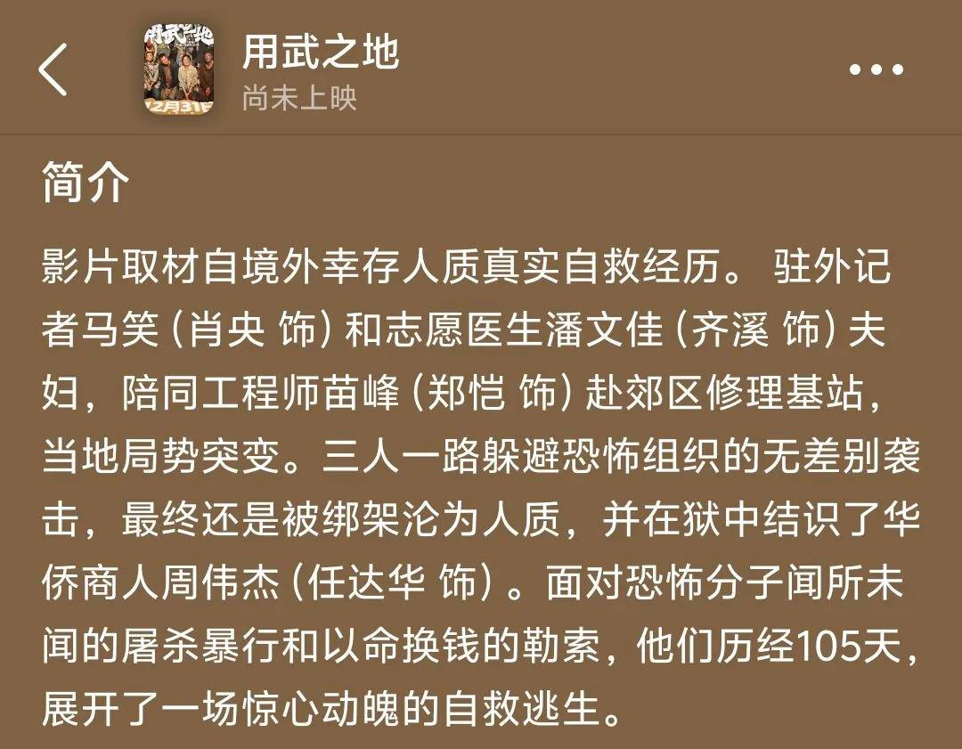 申奥导演的《用武之地》乍一看是唯一一部不卖情怀的片子,结果一看剧情简介,记者、医生、工程师在境外遭遇袭击沦为人质,结识华商自救逃生,好像《孤注一掷》和《万里归途》杂糅版啊。