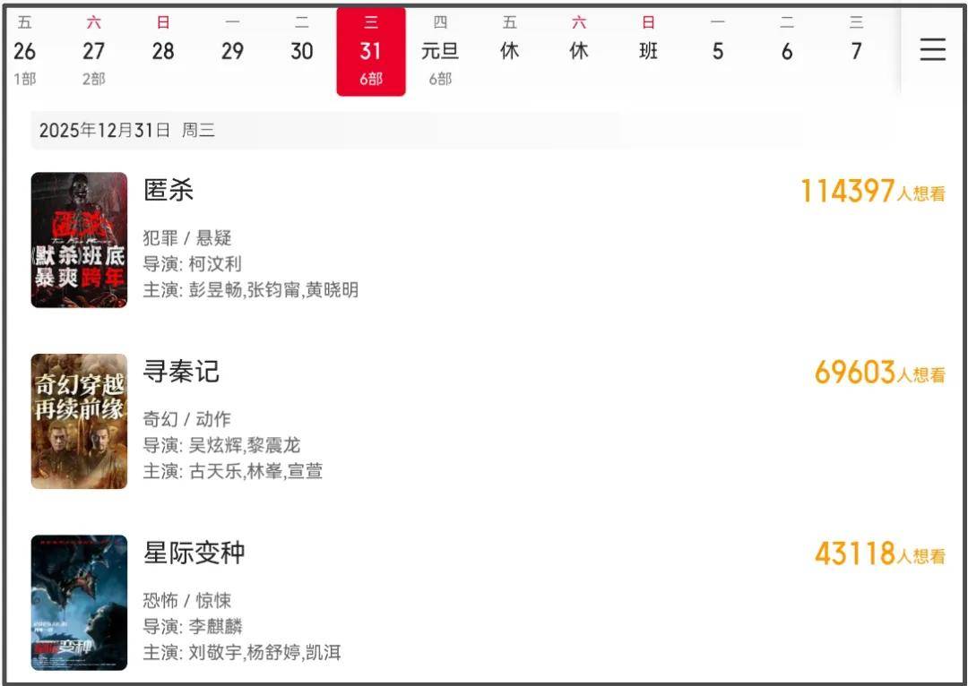 随着电影《寻秦记》官宣定档12月31日,2025年跨年档已有12部新片上映,总结一下档期关键字,主要有两个,一个是“原班人马”,一个是“情怀拉满”。