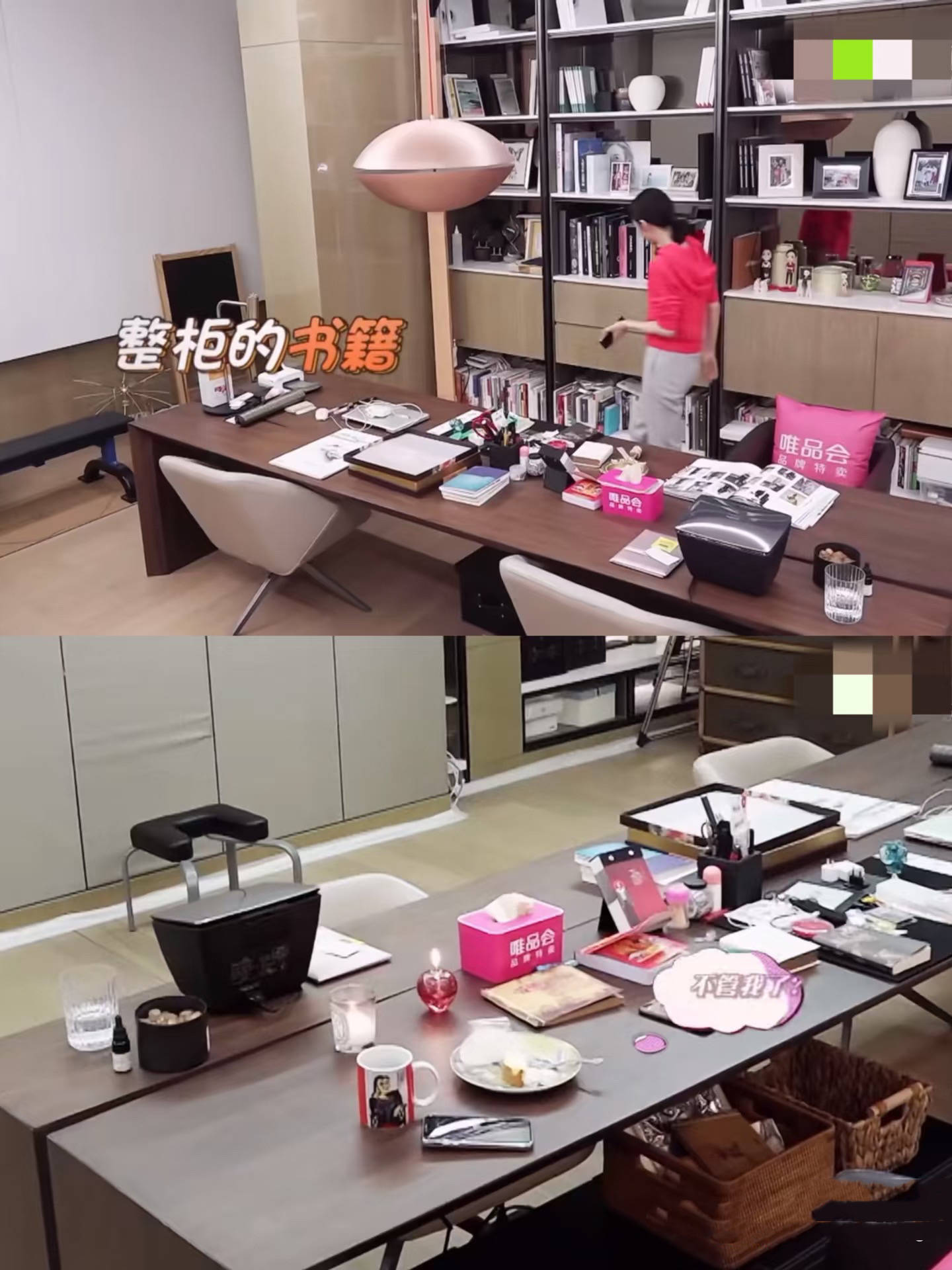 因为要经常在家里工作,王鸥给自己安排了整面墙的书柜。书柜外面是实木的长条桌,平时王鸥就在这里处理一些基本的工作,比如背台词、拍视频等等。