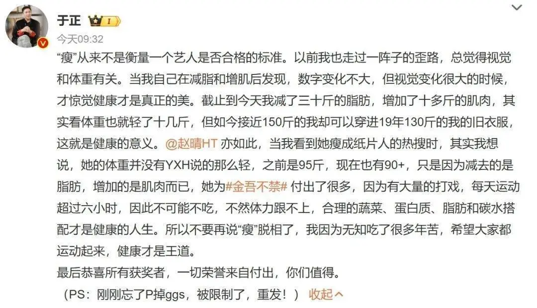 于正写道:“她的体重并没有YXH说的那么轻,之前是95斤,现在也有90+,只是因为减去的是脂肪,增加的是肌肉而已,她付出了很多,因为有大量的打戏,每天运动超过六小时,因此不可能不吃,不然体力跟不上,合理的蔬菜、蛋白质、脂肪和碳水搭配才是健康的人生。所以不要再说‘瘦’脱相了,我因为无知吃了很多年苦,希望大家都运动起来,健康才是王道。”