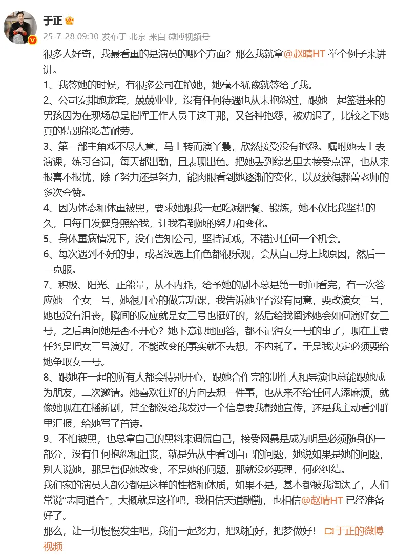 2025年7月28日,于正发长文谈签约演员的标准,拿旗下艺人赵晴举例,列出其9个优点,引发关注。