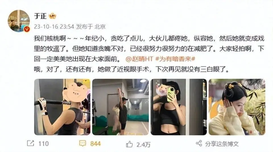 2023年10月16日深夜,于正发文维护旗下艺人赵晴:已经很努力在减肥了,下回一定美美地出现在大家面前。