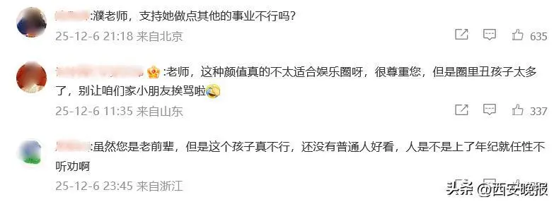 没想到,评论区全面翻车,几乎都是在劝其试试其他行业。“360行,试一试其他的行业。”“濮老师,支持她做点其他的事业不行吗?”“这种颜值真的不太适合娱乐圈。”