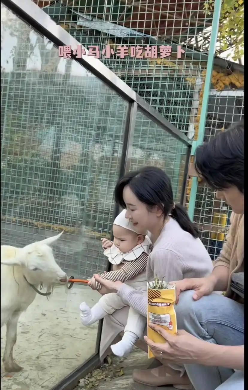 白帽厚袜,胡萝卜喂羊,小手被妈妈包住。