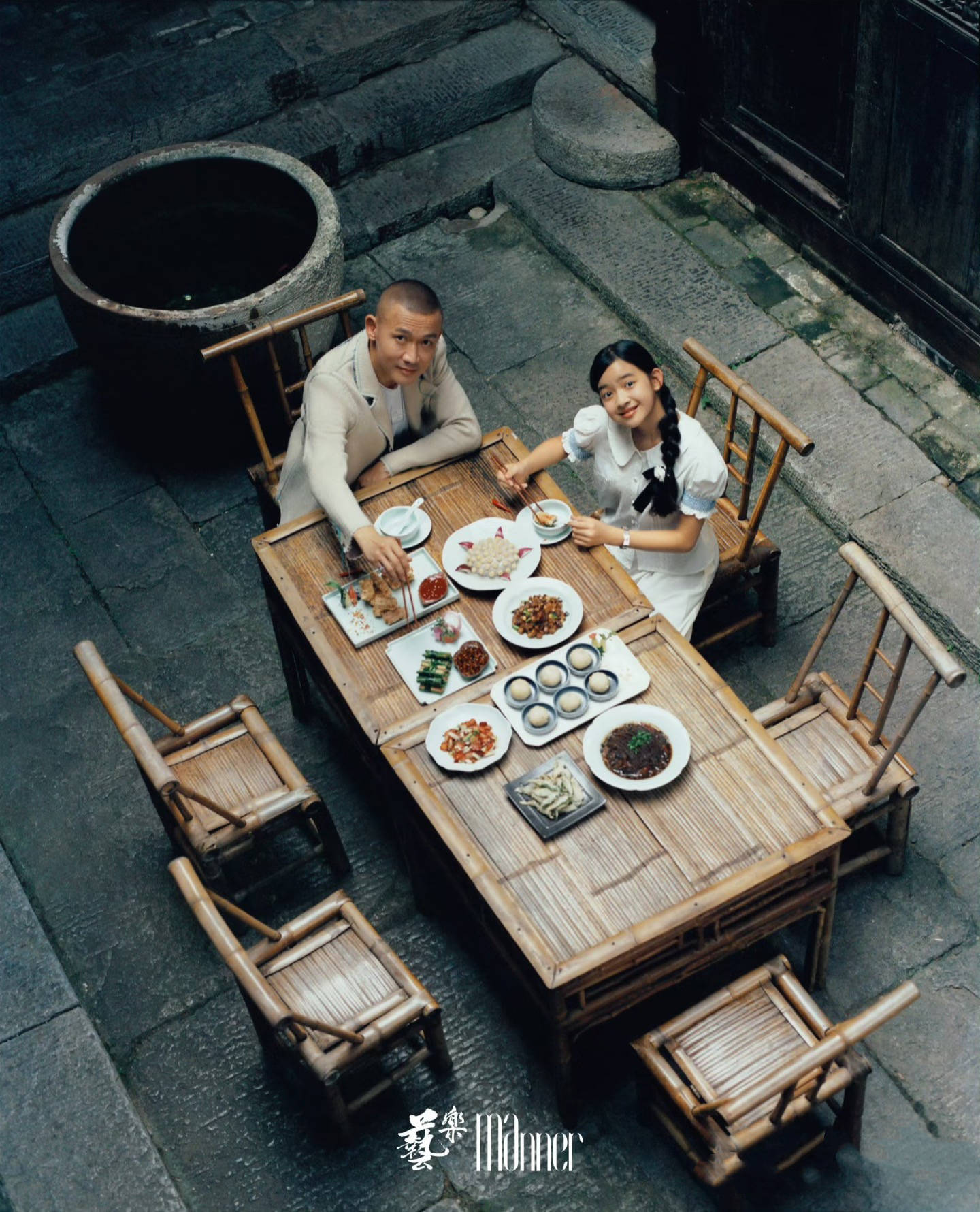 在古朴的院子里,摆上长方形的竹桌,他们就坐在小椅子上,抬头仰望天空、有一种很唯美的意境。
