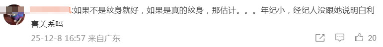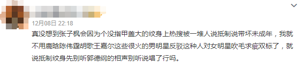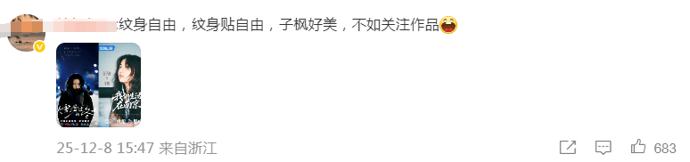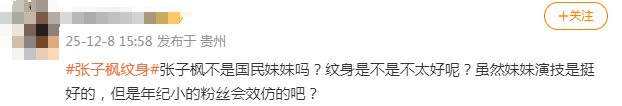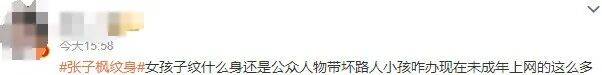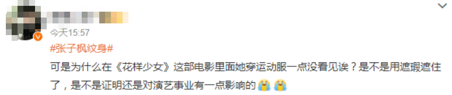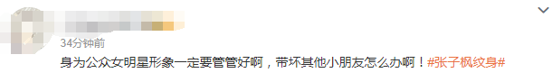 以及看似为了张子枫好,实则暗戳戳瞧不上人家纹身的,“公众人物还是得注意一点”、“要是真的纹了,那就是年纪小,经纪人没跟她说清楚利害关系”、“以后得用遮瑕遮吧,是不是证明对演艺事业还是有影响”……