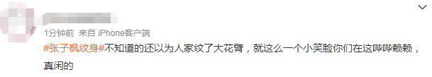 但我万万没想到,还真有不少人因为这个事就开始谴责张子枫,说什么要“坚决抵制纹身艺人”、“女孩子纹什么身”、“还是公众人物呢,带坏小孩子怎么办”、“身为女明星形象一定要管管好啊”……