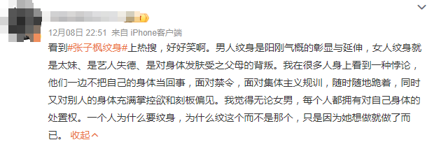 “别对女明星吹毛求疵太双标了”、“怎么男人纹身是阳刚气的延伸,女人纹身就是太妹是艺人失德了”、“无论性别,每个人都有对自己身体的处置权”、“一个人为什么纹身,只是因为她想而已”……