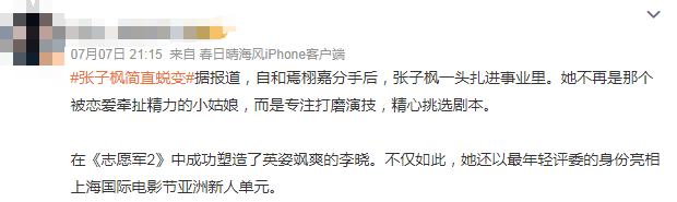 不少网友认为,分手后的张子枫可以专心事业,不再被恋爱拉扯精力,也不会再被渣男消耗路人缘,她只要像以前那样,精心挑选剧本、专注打磨演技,那她就还是那个几乎人见人爱的“国民妹妹”。